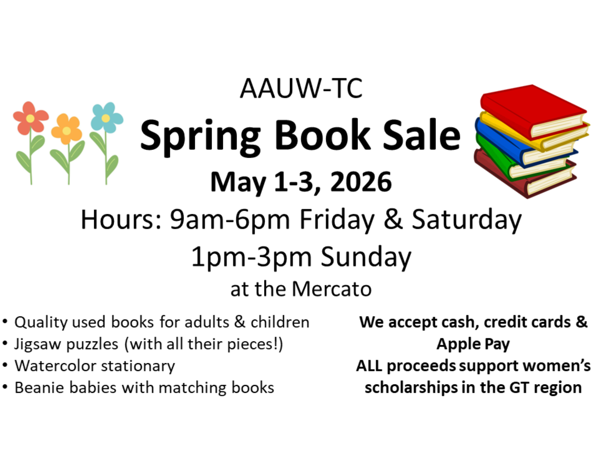 AAUW Book Sale Friday, May 1, 2026 10:00 AM Sunday, May 3, 2026 3:00 PM The Village at Grand Traverse Commons 700 Cottageview Drive Traverse City, MI, 49684 United States (map) Google Calendar ICS