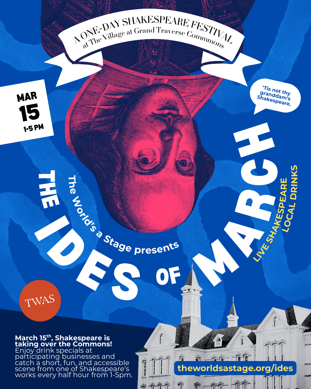 On the Ides of March, you are invited to roam the Village at Grand Traverse Commons for a free Shakespeare festival where food, drink, and live performance intertwine. In partnership with The World’s a Stage, Mashup Rock ‘n Roll Musical, and our local breweries, wineries, and Village businesses, this Sunday afternoon experience is a chance to eat, drink, and witness bite-sized interpretations of Shakespeare performed in unexpected spaces.